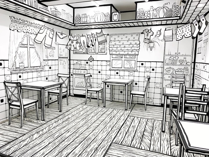 Ngay từ khi bước chân vào quán, thực khách sẽ bị choáng ngợp vì thiết kế nội thất từ tất cả bàn ghế, đồ dùng cho tới sàn, trần, tường... đều được sơn hai màu đen trắng với các đường nét "hoạt hình hóa".